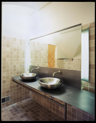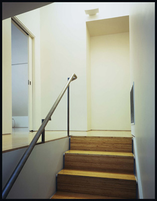 | The stainless steel vanity. The flat pieces were laser cut from a single sheet of material. | The entry stair with Bamboo flooring "runner". |